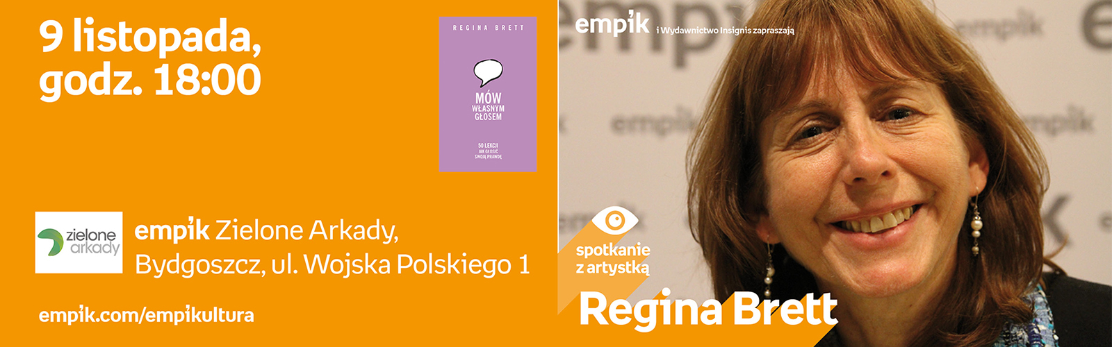 Spotkanie z Reginą Brett odbędzie się 9 listopada o godz. 18:00 na Placu Eventowym w Zielonych Arkadach. Udział w wydarzeniu jest bezpłatny.